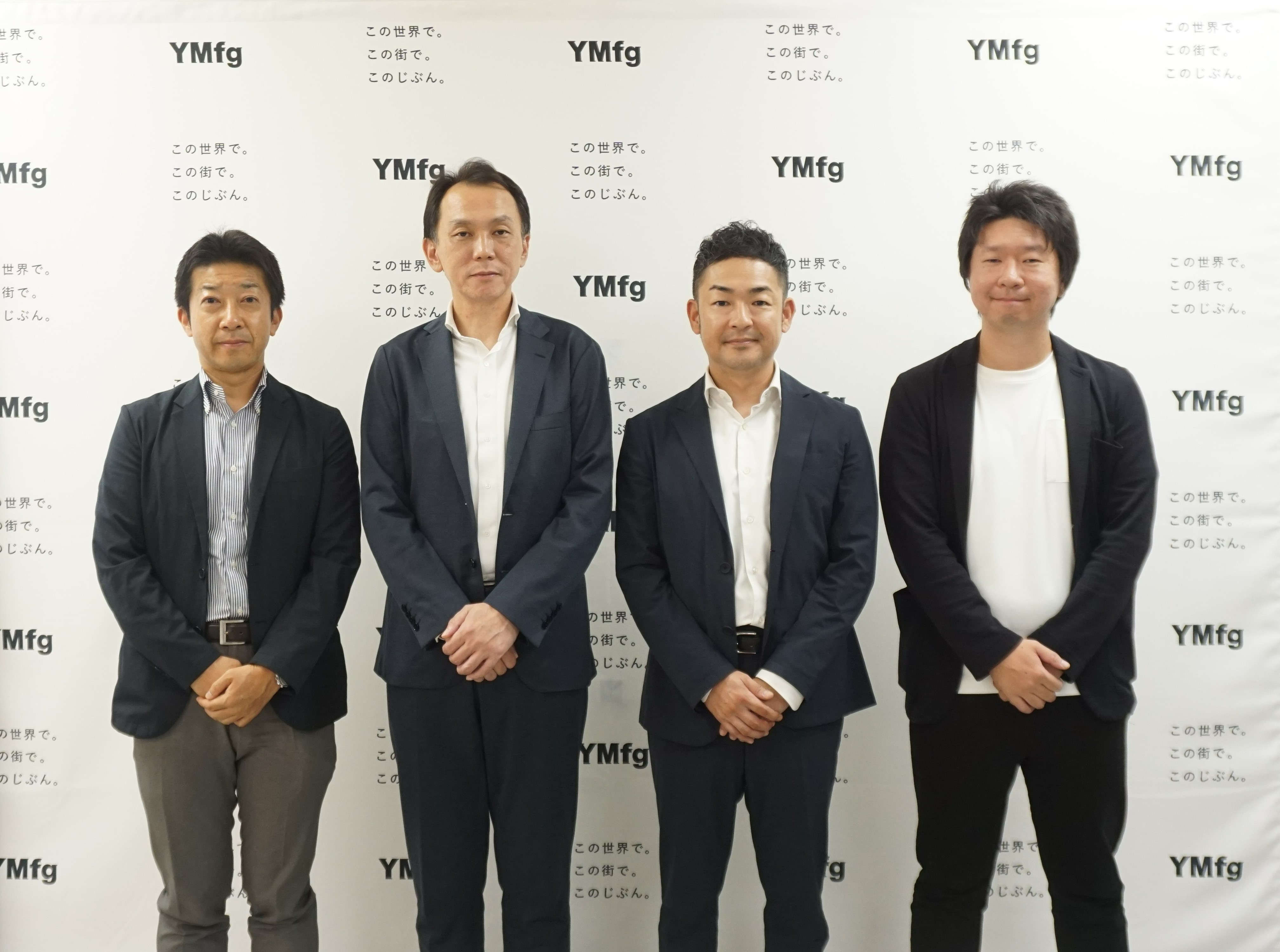 (左から、YMFG ZONEプラニング藏重代表取締役、山口フィナンシャルグループ 村田執行役員、 ドリームインキュベータ 宮内執行役員、エクスペリサス 丸山代表取締役)