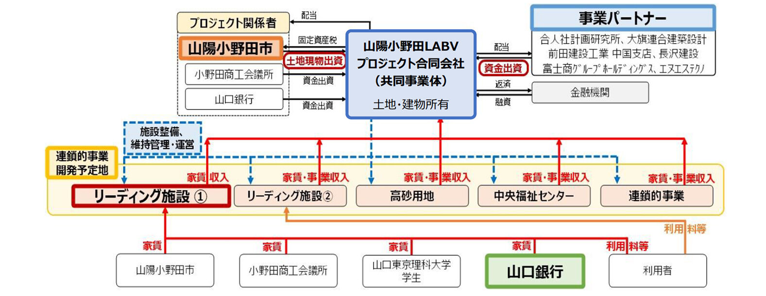 私たちは、山陽小野田市、小野田商工会議所、山口東京理科大学をはじめとする地元関係者と連携し、PPP手法の一つである新たな官民連携スキーム「LABV」を活用したまちづくりプロジェクトを推進しています。