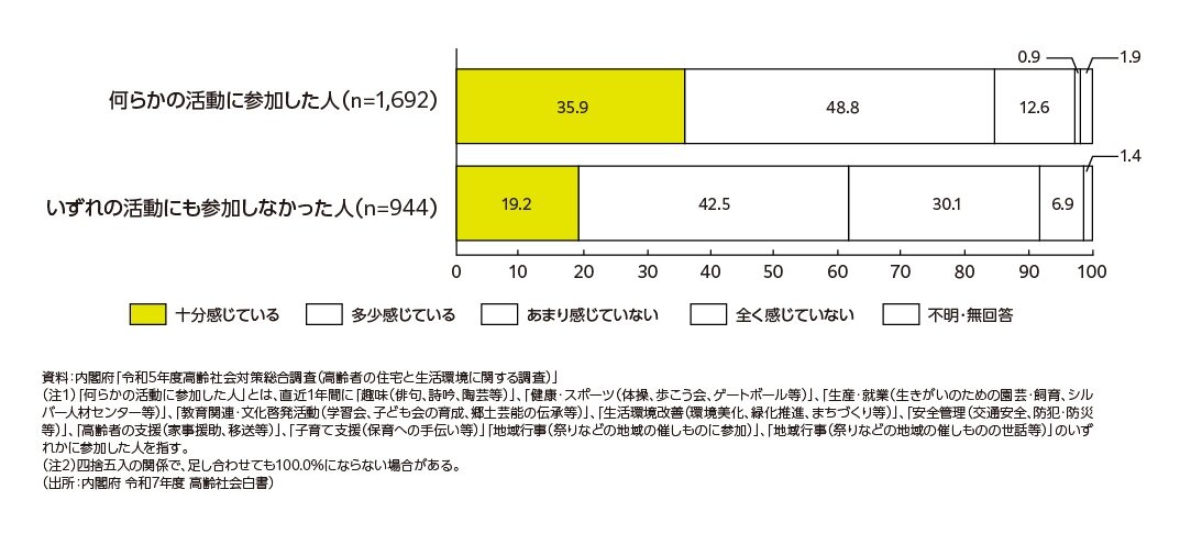 - 65歳以上の方が学習活動や社会活動に参加することで、「生きがいを感じる」割合が高くなることが、高齢社会白書で示されています。