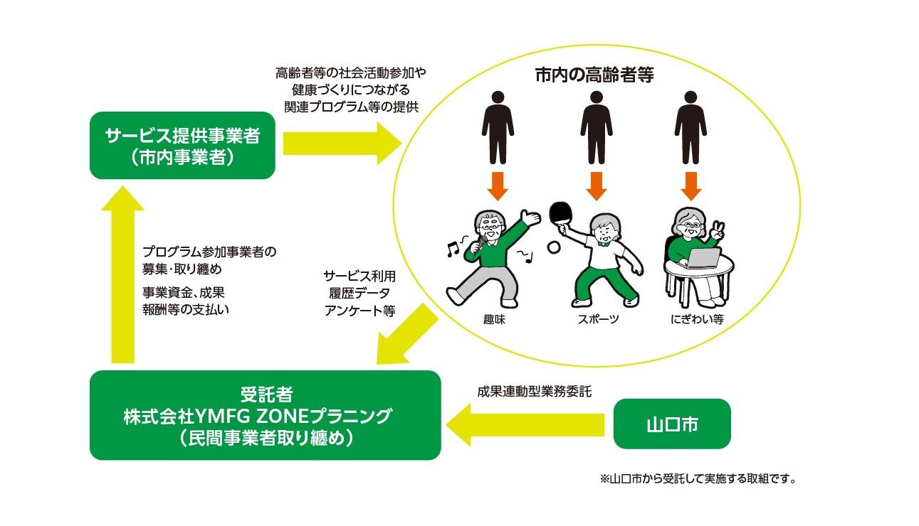- 山口市の取り組みであり、社会的意義があり、サービス提供における訴求力向上が期待できます。高齢者へのサービス提供実績に応じて報酬を得ることができます。