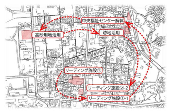 本プロジェクトでは、地元の産官学金と、公募型プロポーザルで選定された民間事業者が連携し、「リーディング施設①(商工センター跡地)」と「リーディング施設②(山口銀行小野田支店跡地)」を含む半径1km圏内の複数拠点を、段階的かつ連鎖的な開発を行っています。
